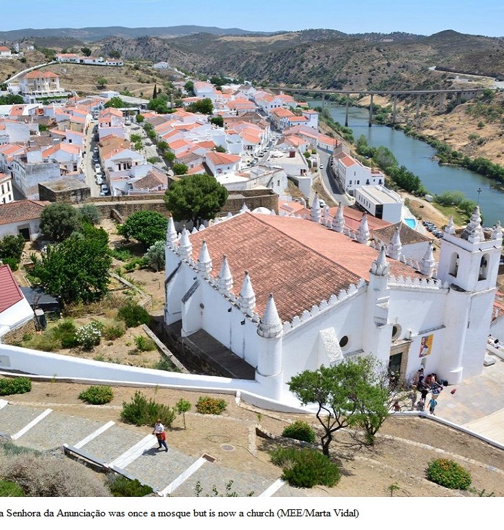 An imposing building with cylindrical towers stands out on the steep hill of Mertola, a…